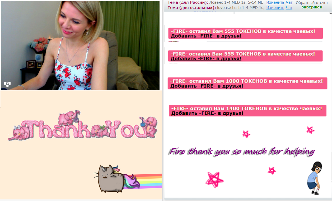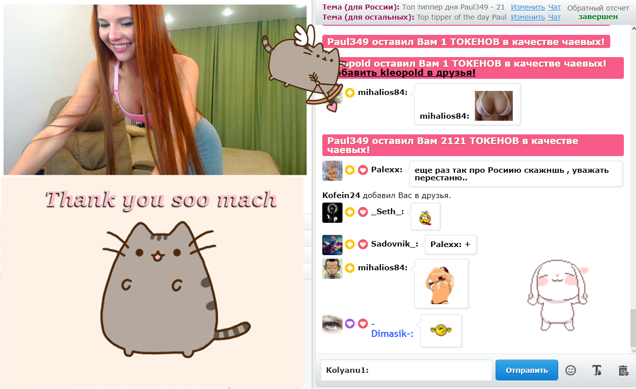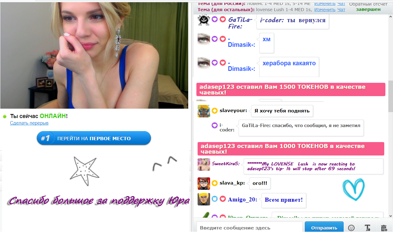 बटन पर क्लिक करके आप SweetKira5 को मुख-पृष्ठ पर 60 सेकंडों के लिए पहले स्थान पर ला सकते हैं. इस समय के दौरान मॉडल का चैटरूम कहीं अधिक दृश्य और अविश्वसनीय रूप से लोकप्रिय हो जाएगा! आपकी इस गतिविधि के बारे में एक सूचना चैट में दिखाई देगी जो मॉडल और अन्य उपयोगकर्ताओं को दिखाई देगी. SweetKira5 को आपकी यह बात जरुर पसंद आएगी और वो आपके प्रति ह्रदय से आभार महसूस करेगी!